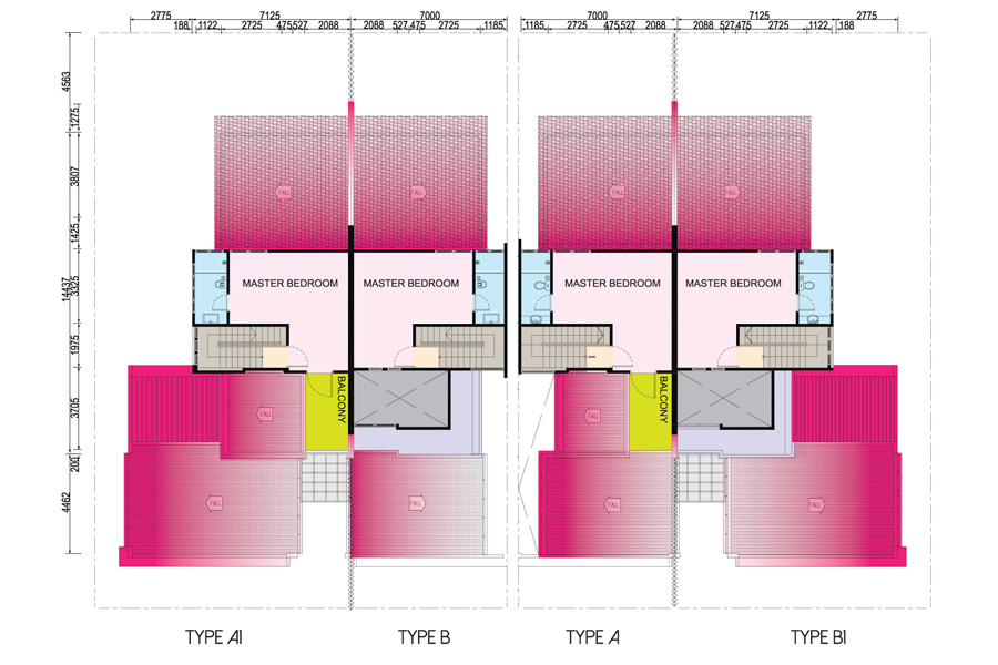 2' x 2' porcelain tiles to living, dining area and ground floor bedrooms. Ceramic tiles to entrance foyer, kitchen, bathrooms and balcony (if any). Laminated flooring to staircase (without skirting) and master bedroom (with skirting).